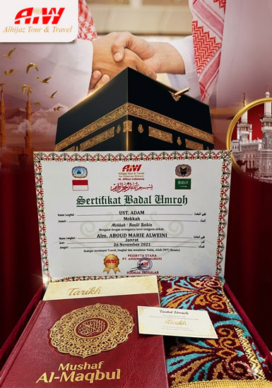 Setelah selesai pelaksanaan, kami akan memberikan sebuah paket bonus (seperti pada gambar) sebagai bentuk komitmen layanan kepada para jamaah sebagai kenang kenangan. Bonus dapat diambil langsung di kantor Alhijaz.